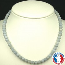 Ce superbe collier, chic et romantique, est réalisé avec des perles de pierres naturelles semi précieuses de Calcédoine Bleue Qualité A de 6 mm, finement polies puis montées sur un solide fil terminé par un fermoir mousqueton doté d'une chaîne d'extension de 6 cm argentée ou dorée (Vous pourrez indiquer votre préférence, que nous respecterons dans la...